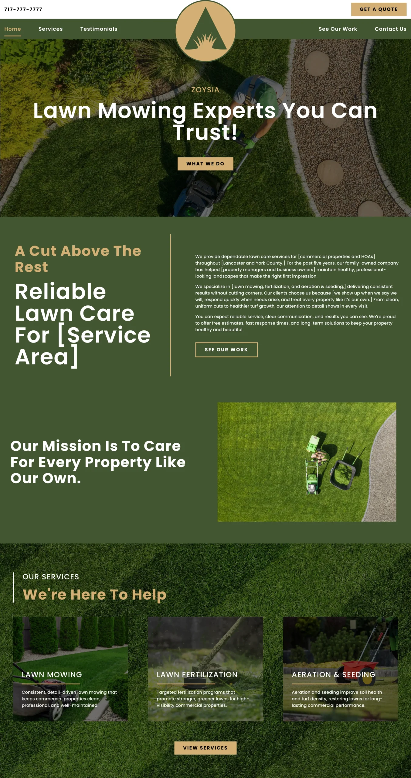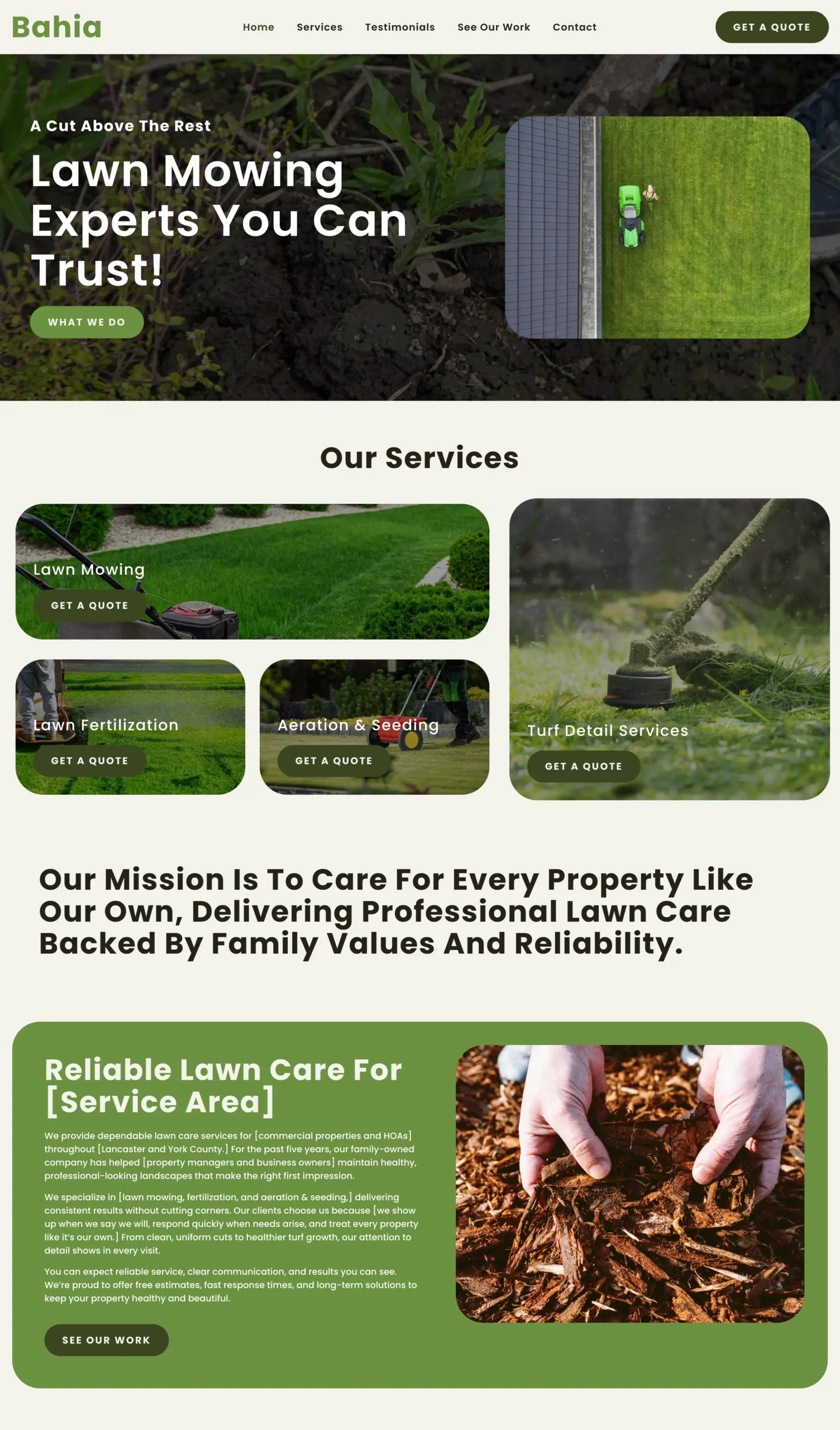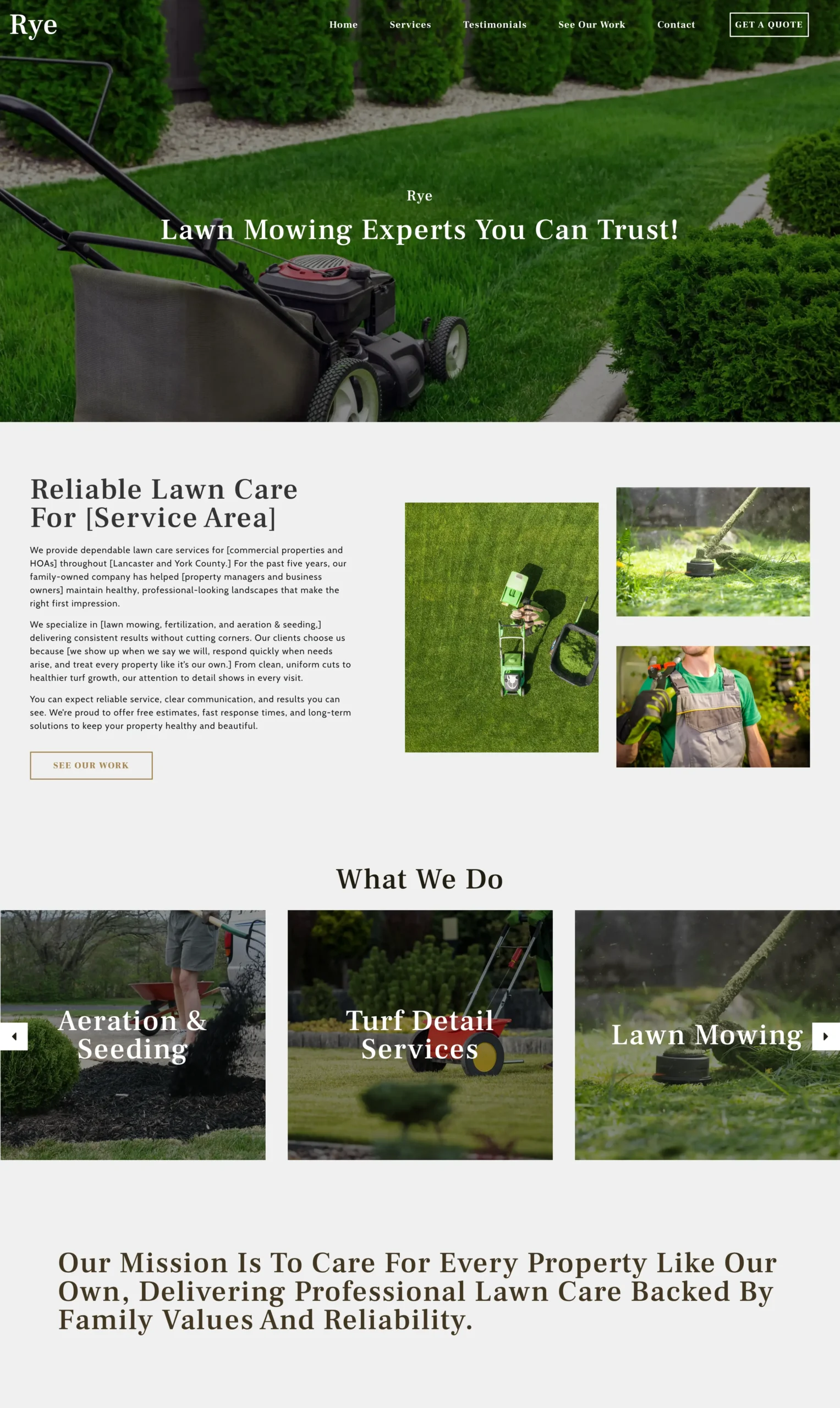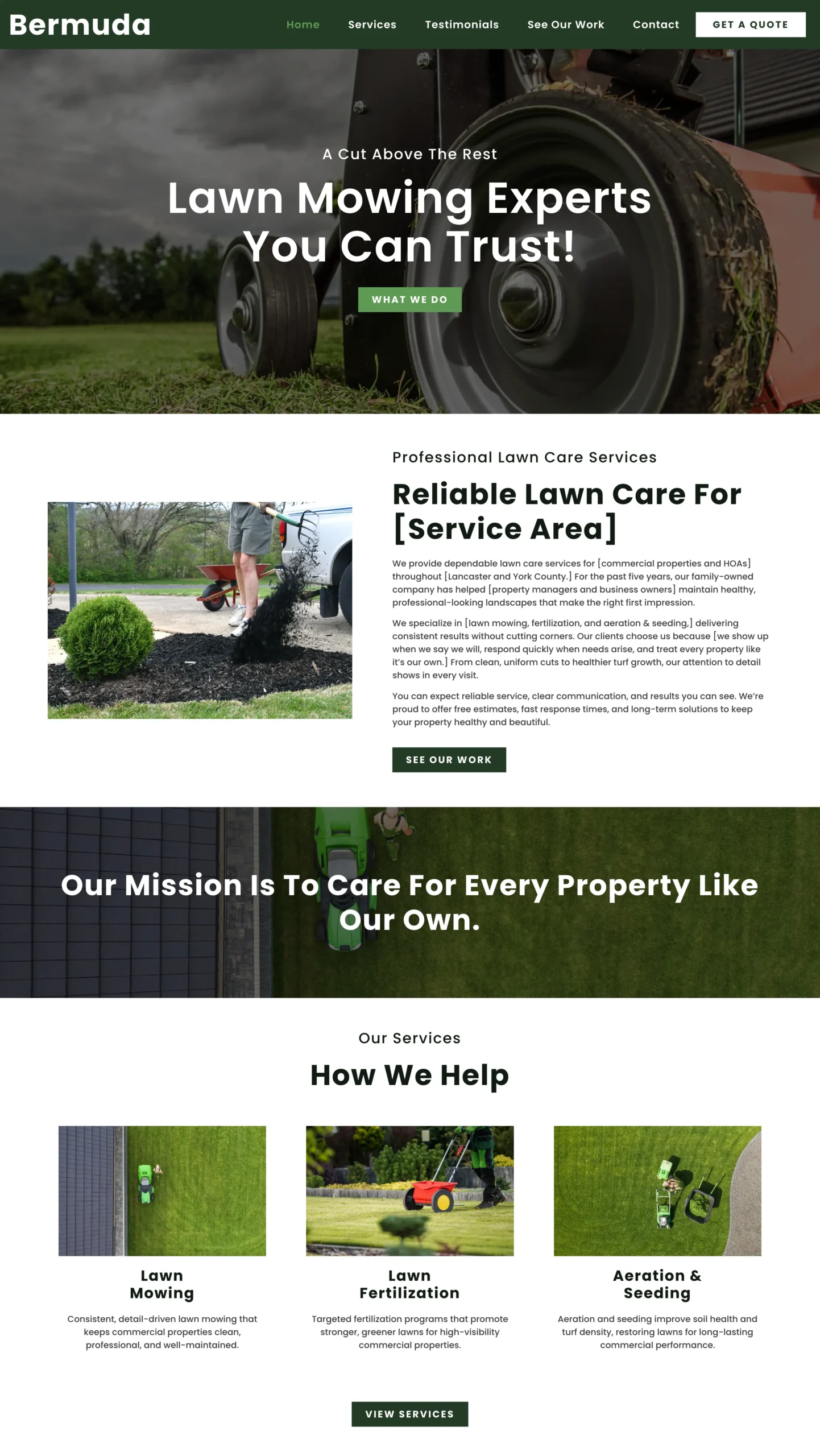 Bermuda is a 5-page website we designed with a clean layout that puts the emphasis on your message and photos of your work. It’s perfect for a lawn care business that prioritizes clear messaging and clear calls-to-action.